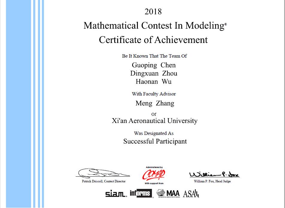 美国大学生数学建模竞赛,是唯一的国际性数学建模竞赛,现已成为世界上影响范围最大的学科竞赛之一,由COMAP(the Consortium for Mathematics and ItsApplication,美国数学及其应用联合会)主办,得到了SIAM(工业和应用数学学会)、NSA(美国国家安全局)、INFORMS(运筹学和管理科学研究协会)等多个组织的大力支持。竞赛设置Outstanding Winner(特等奖)、Finalist(特等奖提名)、Meritorious Winner(一等奖)、Honorable Mention(二等奖)、Successful Participant(成功参赛奖)、UnsuccessfulParticipant(不成功参与奖)。该项赛事始于1985年,至今已成功举办34届,每年都吸引着世界一流高校的优秀学生参与角逐。竞赛赛题分MCM和ICM,要求参赛选手具备扎实的数学、计算机和英文写作功底,解决一道来源于现实生活中的实际问题,并按时提交一份20页左右的英文论文。