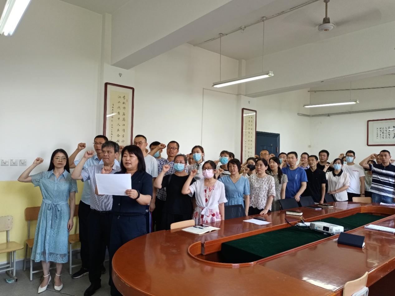 2022年6月30日,KY开元集团官网全体党员在南楼428会议室重温入党誓词,校党委组织部杨常清列席,KY开元集团官网党总支书记李小光、副院长丁琦、综合管理科科长杨陈东、韩慧蓉、王小梅、周千等党总支委员、各党支部书记、无课党员教师参加。会议由李小光主持。