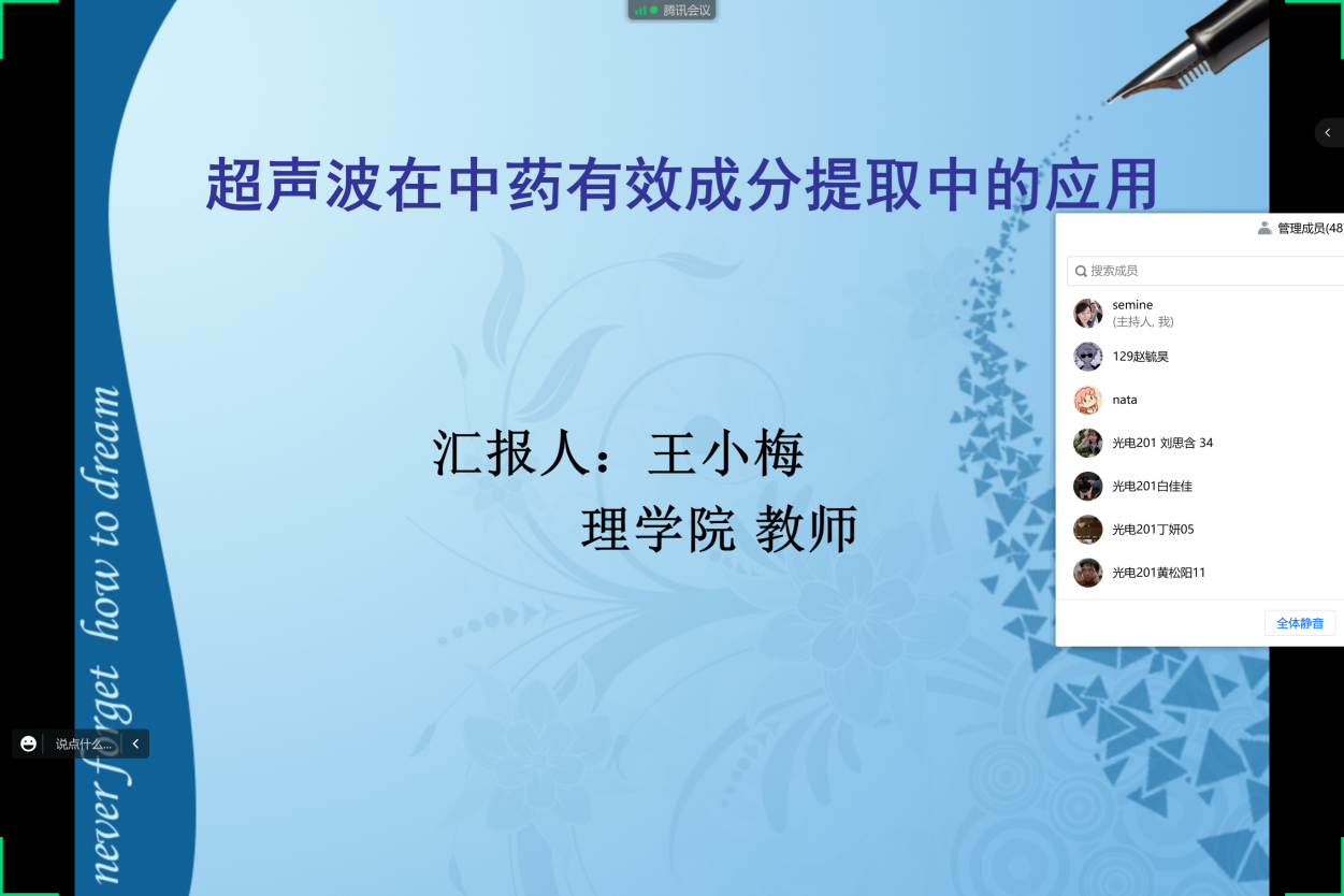 2022年9月17日,KY开元集团官网在腾讯会议线上举办了“超声波在中药有效成分提取中的应用”学术讲座,此次讲座由物理教研室主任王小梅主讲。