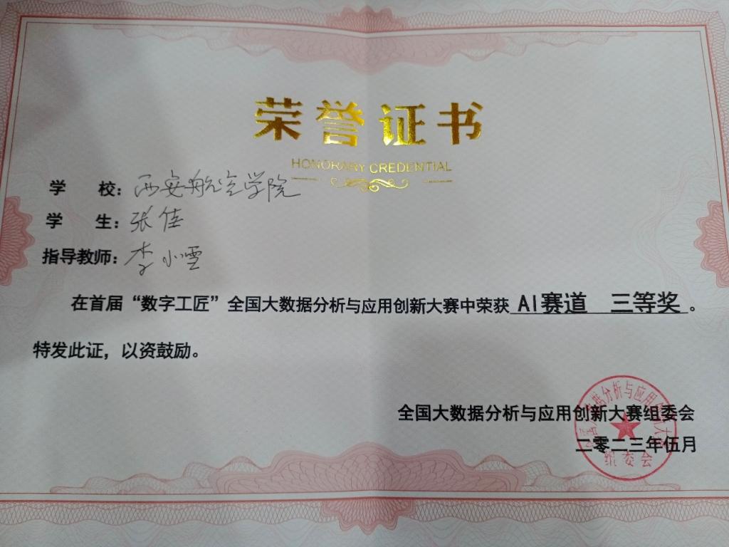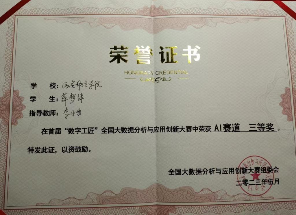 近日,由机械工业经济管理研究院指导,《智慧中国》杂志社、国声智库主办,西安理工大学、美林数据技术股份有限公司承办的首届“数字工匠”全国大数据分析与应用创新大赛总决赛在西安理工大学曲江校区顺利举行,经过激烈角逐,KY开元官网李小雪和王苗苗老师指导的信息计算202班薛梦津、张佳2名同学组成的“祺珩”队,荣获AI赛道全国三等奖。
