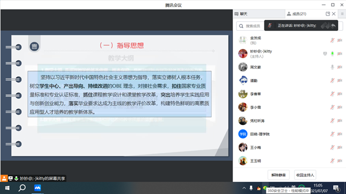 为进一步提高人才培养质量,加强课程思政建设,KY开元集团官网物理教研室于2023年7月7日下午以线上会议方式,召开了2023版光电信息科学与工程专业教学大纲修订与编制研讨会。物理教研室全体成员参加了该会议,会议特邀了学院党总支书记胡红亮和丁琦副院长参加,金发成召集主持。