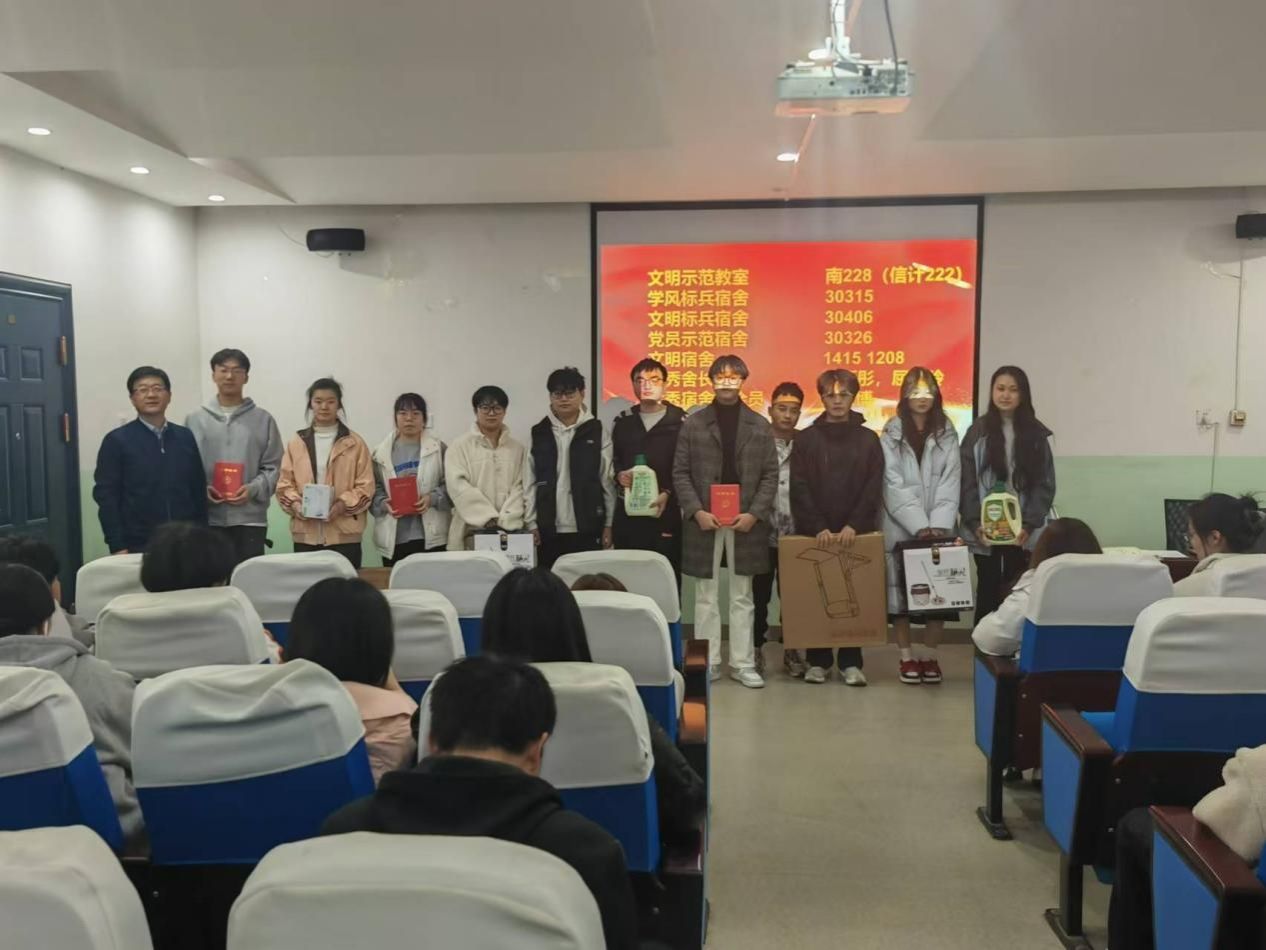会议伊始,王向阳宣读了表彰文件,共包含“文明示范教室”“学风标兵宿舍”“文明标兵宿舍”“党员示范宿舍”“文明宿舍”“优秀舍长”“优秀宿舍安全员”等七个奖项。随后,胡红亮为获奖集体和个人颁奖。文明标兵宿舍代表乔靖钰和优秀舍长和昕彤分别作交流发言,分享了他们在宿舍建设中的经验和心得。