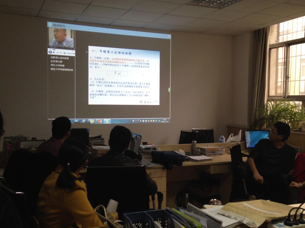 活动伊始,物理教研室主任郝大鹏,针对微课在促进教学中的作用进行了详细的讲解,使老师们更合理更充分的利用课堂时间,提高效率。郝大鹏利用现代微课录制的仪器,选取了《质心运动定理》的课程内容,给大家进行了简单的演示和操作。