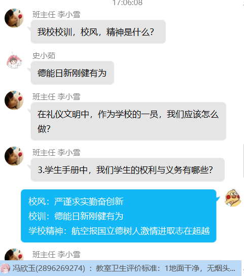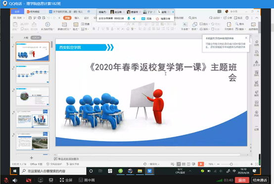 各班级分别使用腾讯会议、腾讯课堂、钉钉视频会议、QQ群、微信群等线上平台开展主题班会,首先各班主任分别带领同学们集中学习了《西安航空学院本科教学工作合格评估学习手册(学生版)》《关于全面加强新时代大中小学劳动教育的意见》《西安航空学院劳动学分认定及管理办法(试行)》《西安航空学院教室卫生责任制实施方案》,并且观看了《金灿荣--国际角度看中国战“疫”》视频。随后围绕班会有关内容在线上进行交流讨论、互问互答,同学们交流积极踊跃,营造了一个良好的开学氛围。(文/唐紫怡 图/各班级提供)