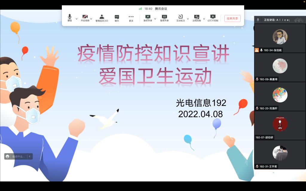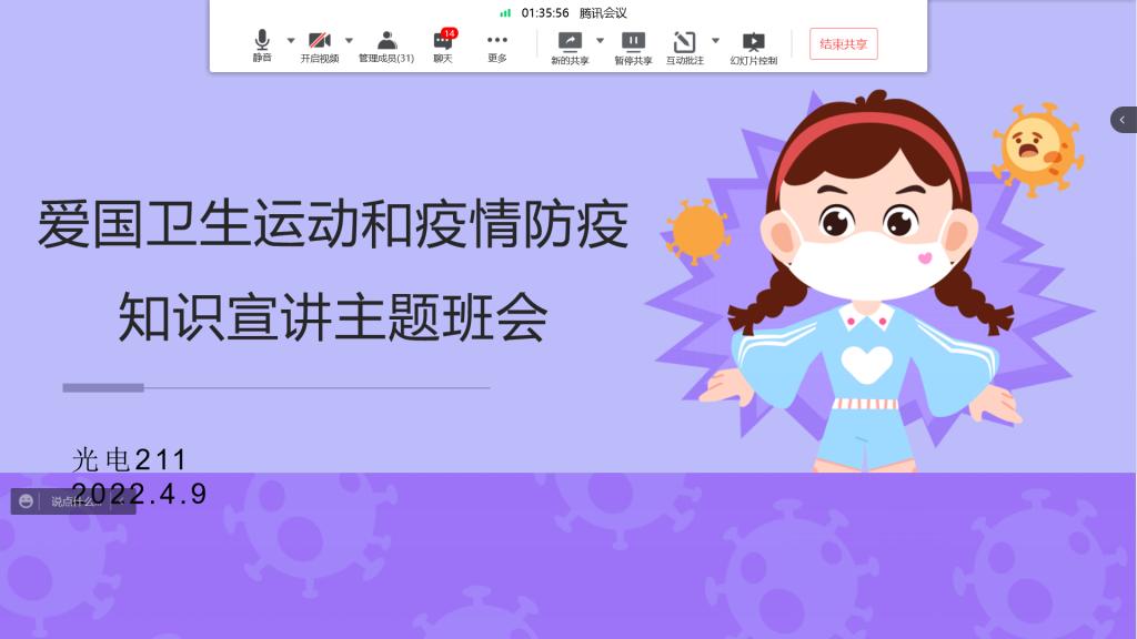 按照《关于莲湖校区学生公寓驻楼工作专班后续有关工作的通知》,2022年4月6日至4月10日,KY开元集团官网各班级陆续召开了“爱国卫生运动及疫情防疫知识宣讲”线上主题班会。