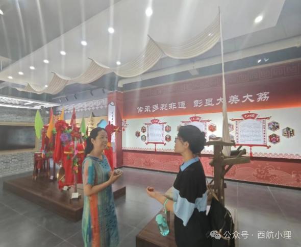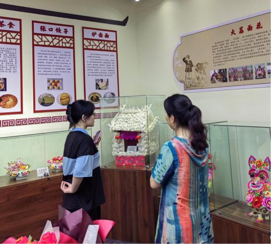 首先,实践队成员们参观了大荔县非遗体验馆。大荔县非遗体验馆分别由“拿手好戏——大荔戏曲空间”“非凡匠心——工艺流畅”和非遗体验区等6个展区组成。在参观过程中,讲解员向成员们介绍了“大荔面花”“大荔土布制作技艺”“同州梆子”和“朝邑剪纸”等当地的非物质文化遗产,其中,“大荔土布制作技艺”尤其让成员们印象深刻。