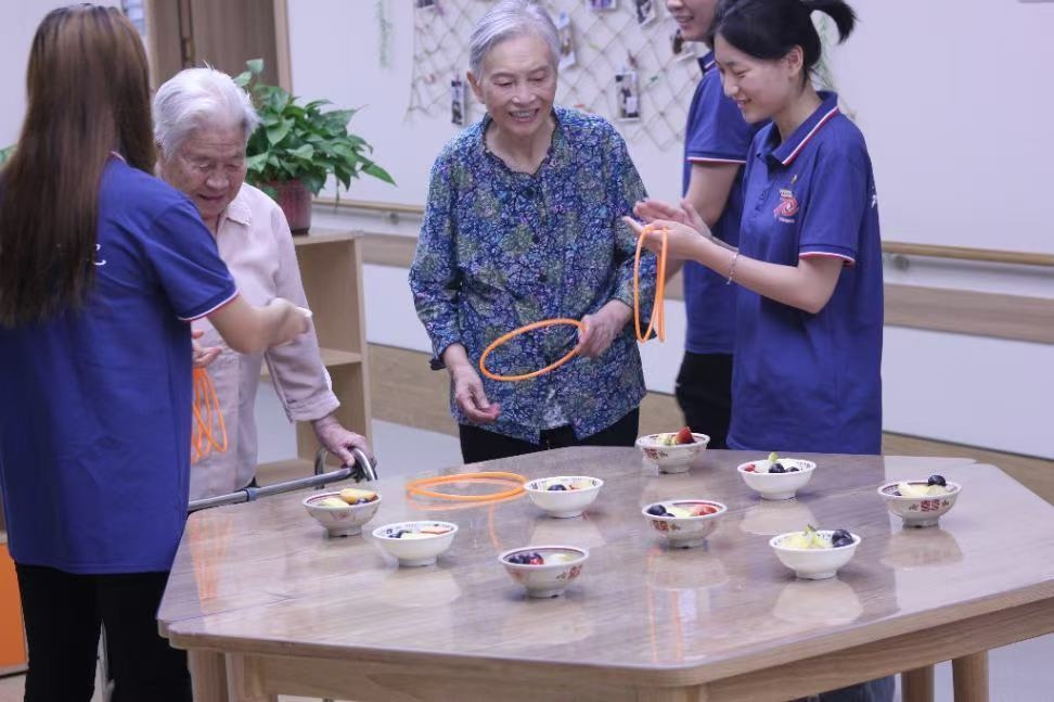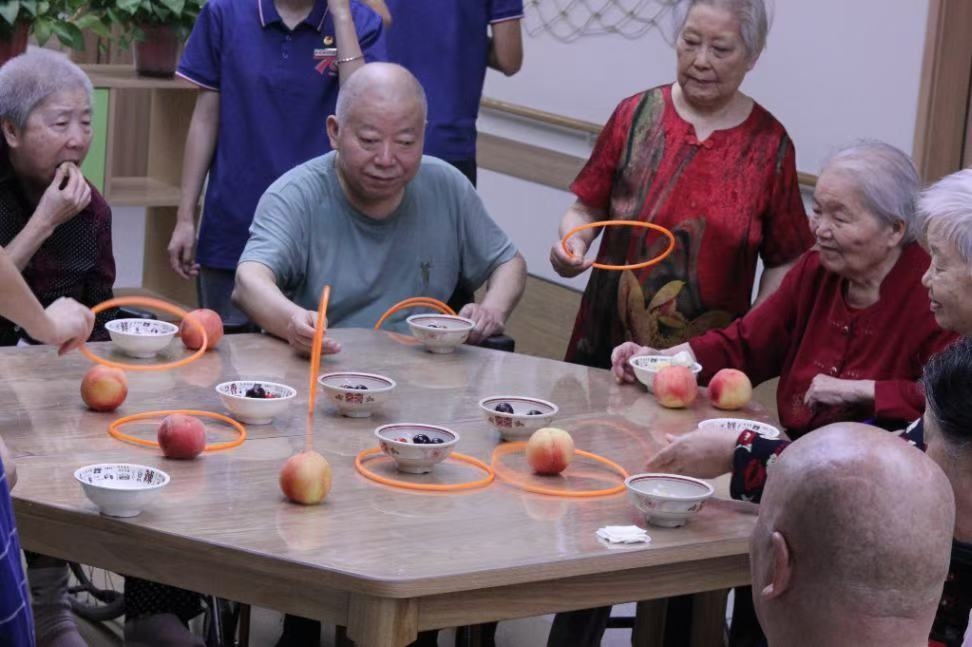 空气中弥漫着清甜的果香,碗碟盛放着洗切分好的桃肉、葡萄、荔枝和小番茄,如同夏日调色盘。一隅空地被清晰划开,成为游戏的战场——这里,西安航空学院“青春助老行,共话夕阳红”暑期实践队的年轻面孔,正在福禧康健康照护中心,为暮年的眼眸点燃一簇期待。