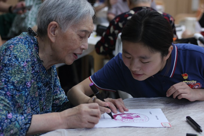曼陀罗绘画,是活动最美的章节。实践队员们化身贴心助手,为视力模糊的长者递上放大镜,助行动不便的老人稳定画笔,悄然间添补缤纷颜料。他们俯身倾听,轻声询问:“爷爷,您想涂什么颜色?”“奶奶,这个图案搭配真好看!”平凡的画笔在长者们手中,流淌出不平凡的热爱——褶皱的手握着蜡笔,笔尖下流泻出阳光的暖色、天空的澄澈……每一幅独一无二的作品,都是此刻心绪的无声绽放,见证着专注的宁静与创作的喜悦