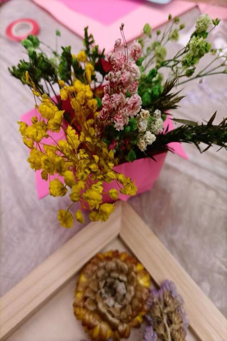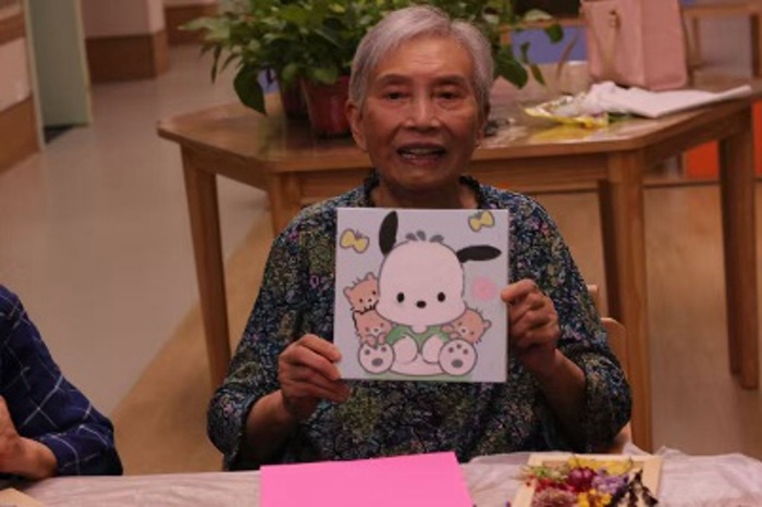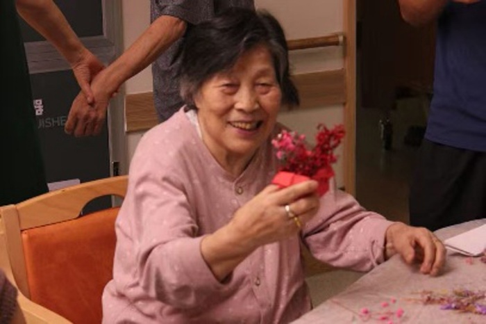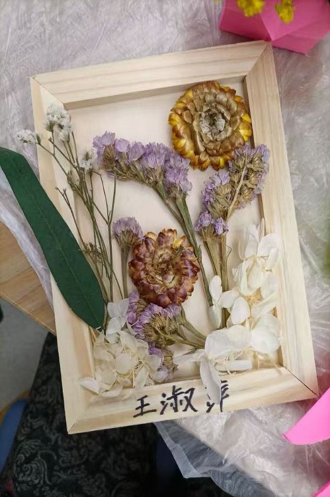 80岁的张爷爷在志愿者的协助下,精心挑选了粉色玫瑰和白色满天星进行创作。他小心翼翼地将花朵排列组合,最终完成了一幅满意的作品。“年轻时就很喜欢侍弄花草,没想到晚年还能学会制作这么雅致的干花相框!”张爷爷手捧自己的作品,脸上洋溢着自豪与喜悦的笑容。活动中,长者们充分发挥想象力与创造力,将各色干花巧妙组合,创作出一幅幅独具匠心的艺术作品。有的作品清新淡雅,有的则色彩明快、充满活力,每一幅都承载着长者们对美好生活的热爱与向往。