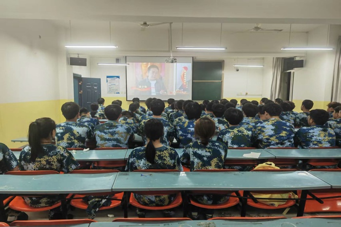 除了高强度的体能训练,学院还精心安排了多元军训活动。夜晚的“爱国电影课堂”中,新生们整齐端坐,身姿挺拔,安静专注地凝视银幕。整个教室肃穆无声,只有影片中的对白与旋律缓缓流淌。他们目光如炬,神情庄重,随着剧情推进时而凝神屏息,时而目光闪动;当国旗升起、英雄凯旋的画面出现,不少人不由自主地挺直脊背,眼中闪烁着坚定与敬仰。这堂没有讲台的“课”,以光影为笔、以故事为墨,让爱国情怀在沉浸式的体验中深深烙印,成为军训夜里一场深刻的精神洗礼。