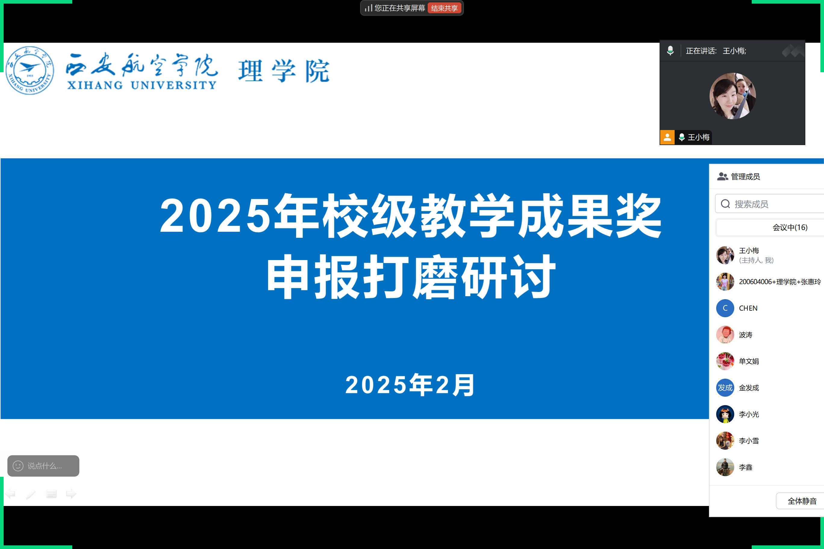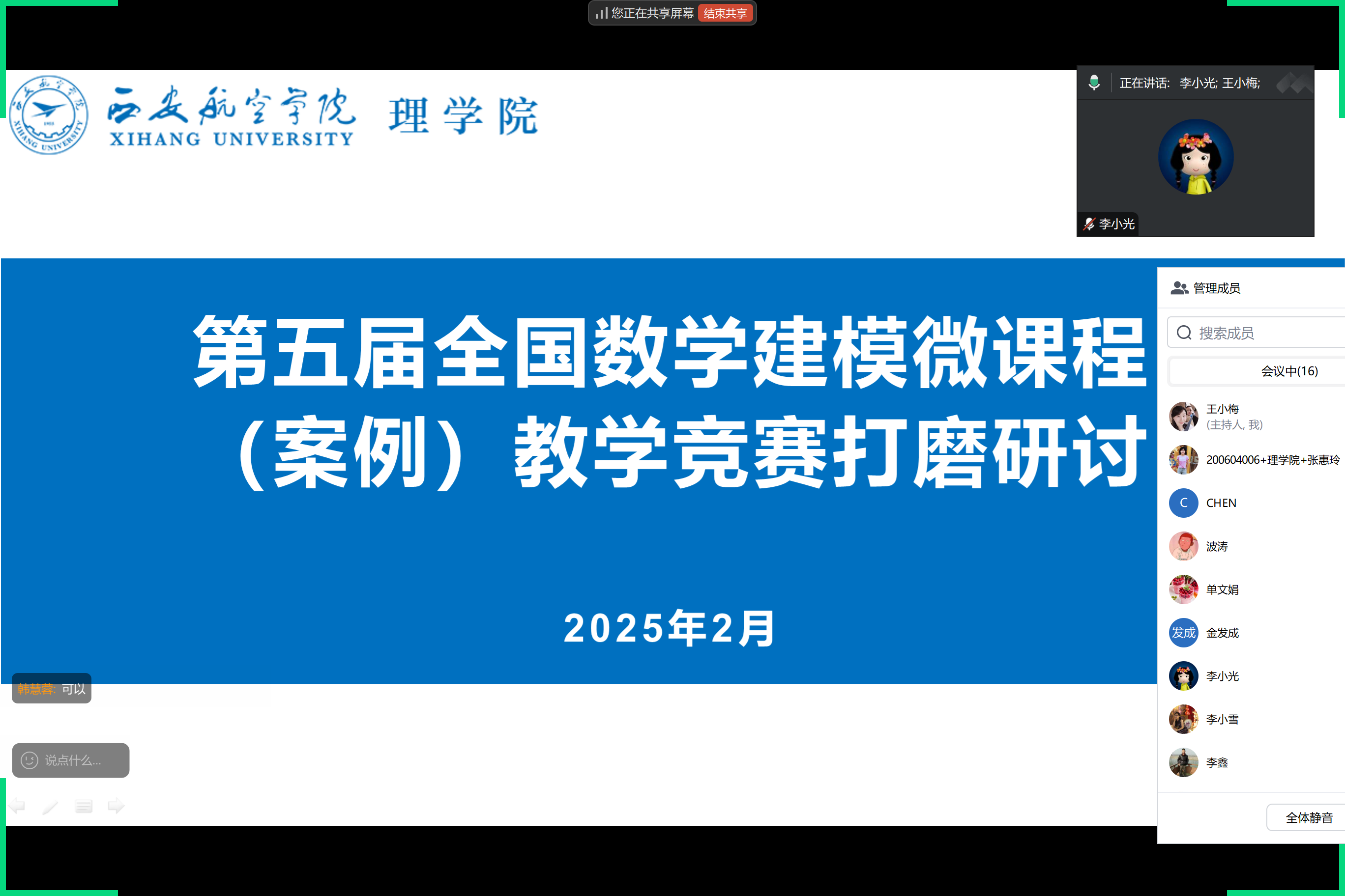 为进一步提升数学建模课程教学质量,推动教学成果凝练与申报,KY开元集团官网于2月21日开展了“第五届全国数学建模微课程(案例)教学竞赛”与“2025年教学成果奖申报书”打磨研讨会。学院院长李小光、副院长韩慧蓉及骨干教师参加了此次活动,会议由院长助理王小梅主持。