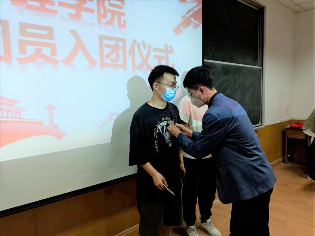 随着主持人宣布入团仪式开始,全体同学起立奏唱国歌,对国旗行注目礼。张超康向大家说明了举行入团仪式的意义,宣读了2021年新团员名单,分别是郭晓锴、董林涛、解超越三位同学,因为疫情原因,董林涛同学线上参加本仪式。