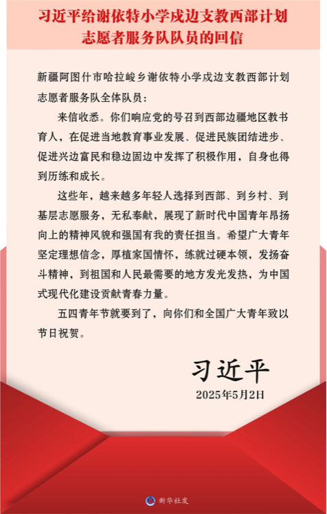 新华社北京5月3日电 在五四青年节到来之际,中共中央总书记、国家主席、中央军委主席习近平给新疆克孜勒苏柯尔克孜自治州阿图什市哈拉峻乡谢依特小学戍边支教西部计划志愿者服务队全体队员回信,向全国广大青年致以节日祝贺并提出殷切期望。