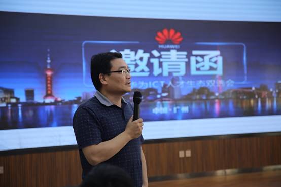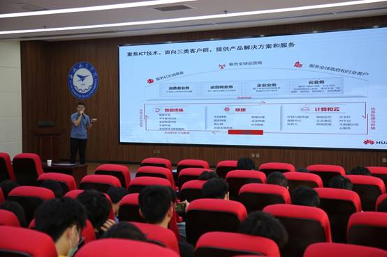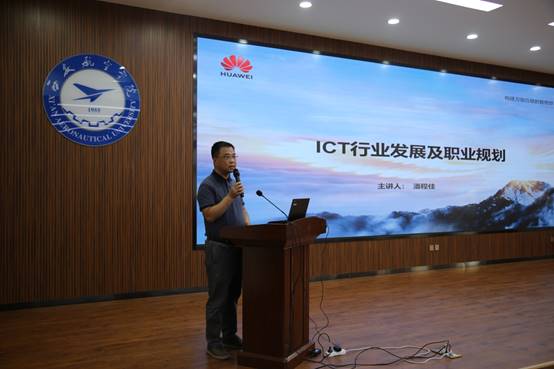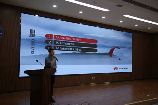 首先,陕西华为授权认证中心生态合作部业务经理潘程佳老师从华为简介、主流技术之间的关系、华为ICT认证评定标准、华为职业认证的定义、华为ICT学院管理政策刷新导向等方面为大家介绍了华为认证职业导向,让同学们对华为、对ICT有宏观的认识。