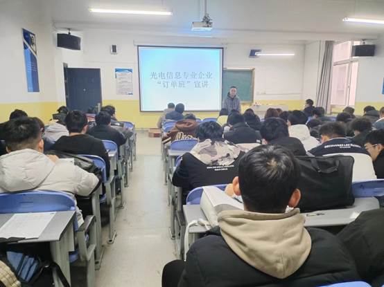 会上,曹建波对订单班的培养方案、企业的具体要求、人才培养目标和未来职业发展路径向同学们进行了详细介绍;王妙讲解了企业的产业成果、企业实力、企业文化和订单班的课程安排;张岩解答了同学们提出的各种疑惑,并鼓励大家抓住机会,为就业做好准备。会后,同学们积极踊跃报名,并与老师们深入沟通订单班的各项要求。